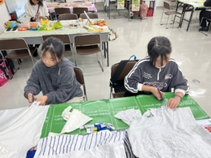 地元らしいワークショップということで、高円寺の古着屋さんからいただいた古着からエコバッグを作るワークショップを行いました!