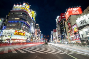 夜の歌舞伎町、ドン・キホーテの看板が輝く交差点。