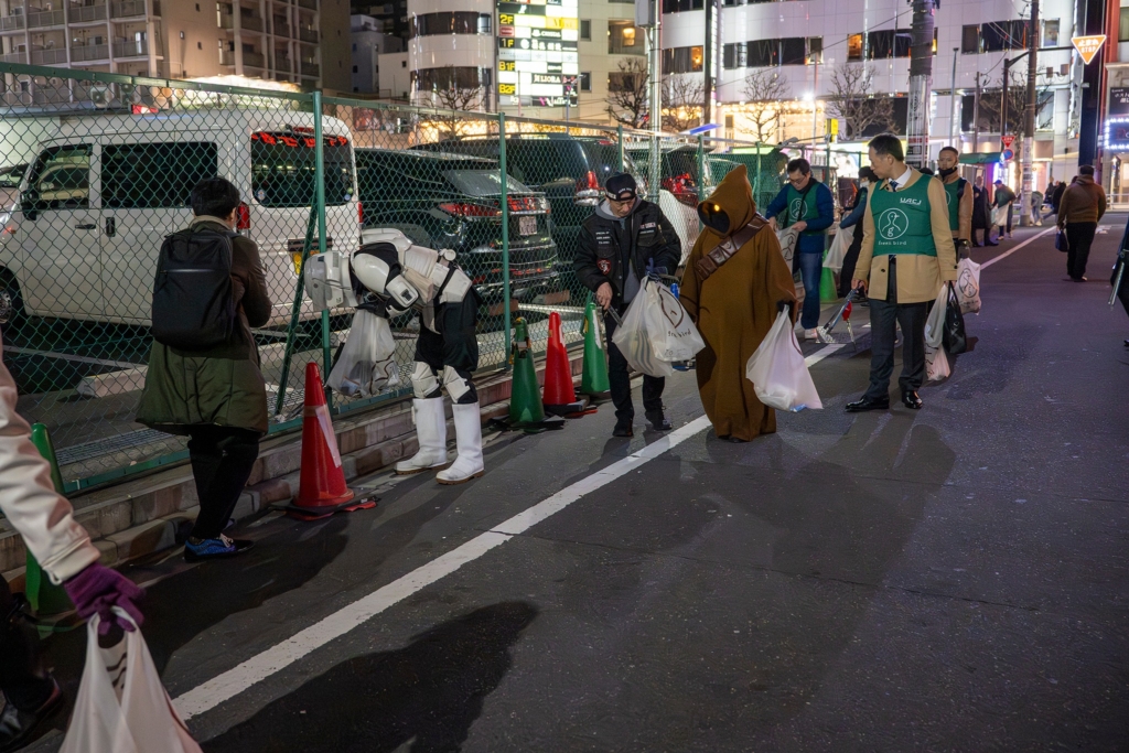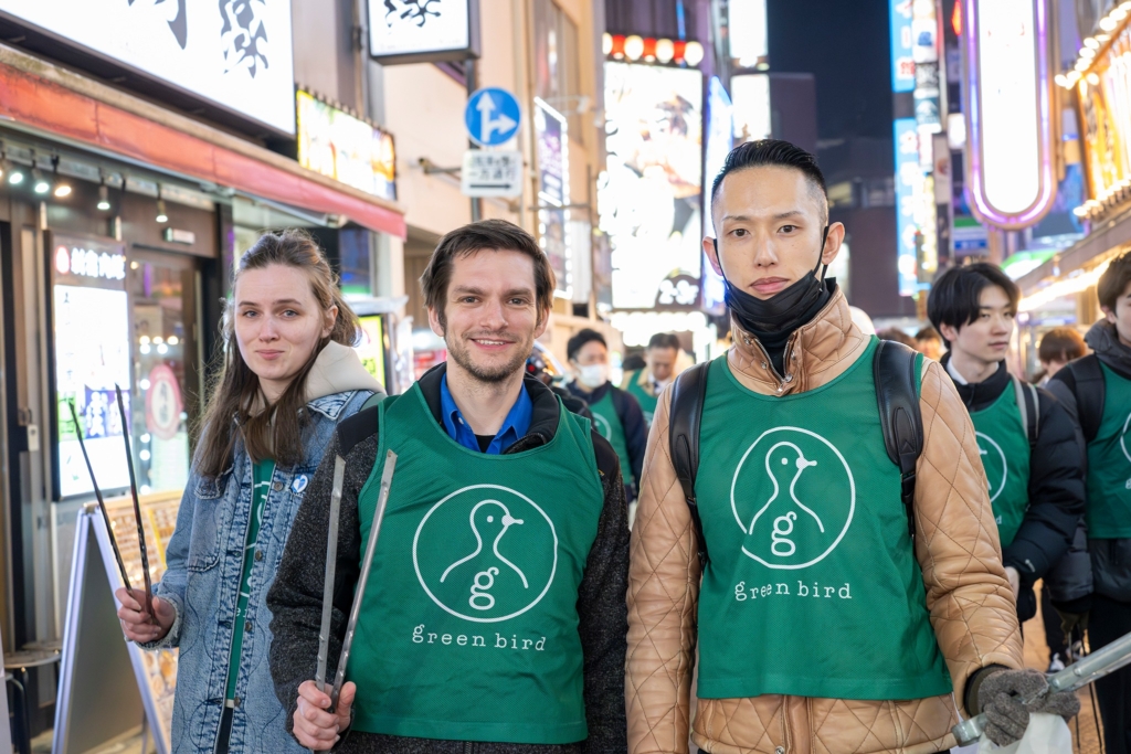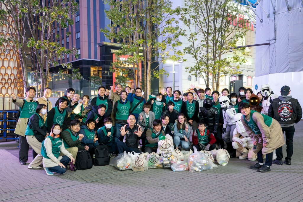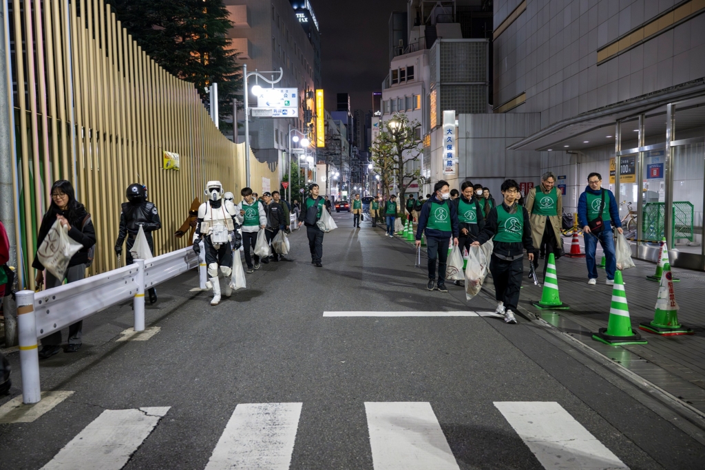グリーンバードのベストを着たスタッフの皆さんと一緒に、コスチュームのまま本格的にゴミを拾う姿がなんとも頼もしい。